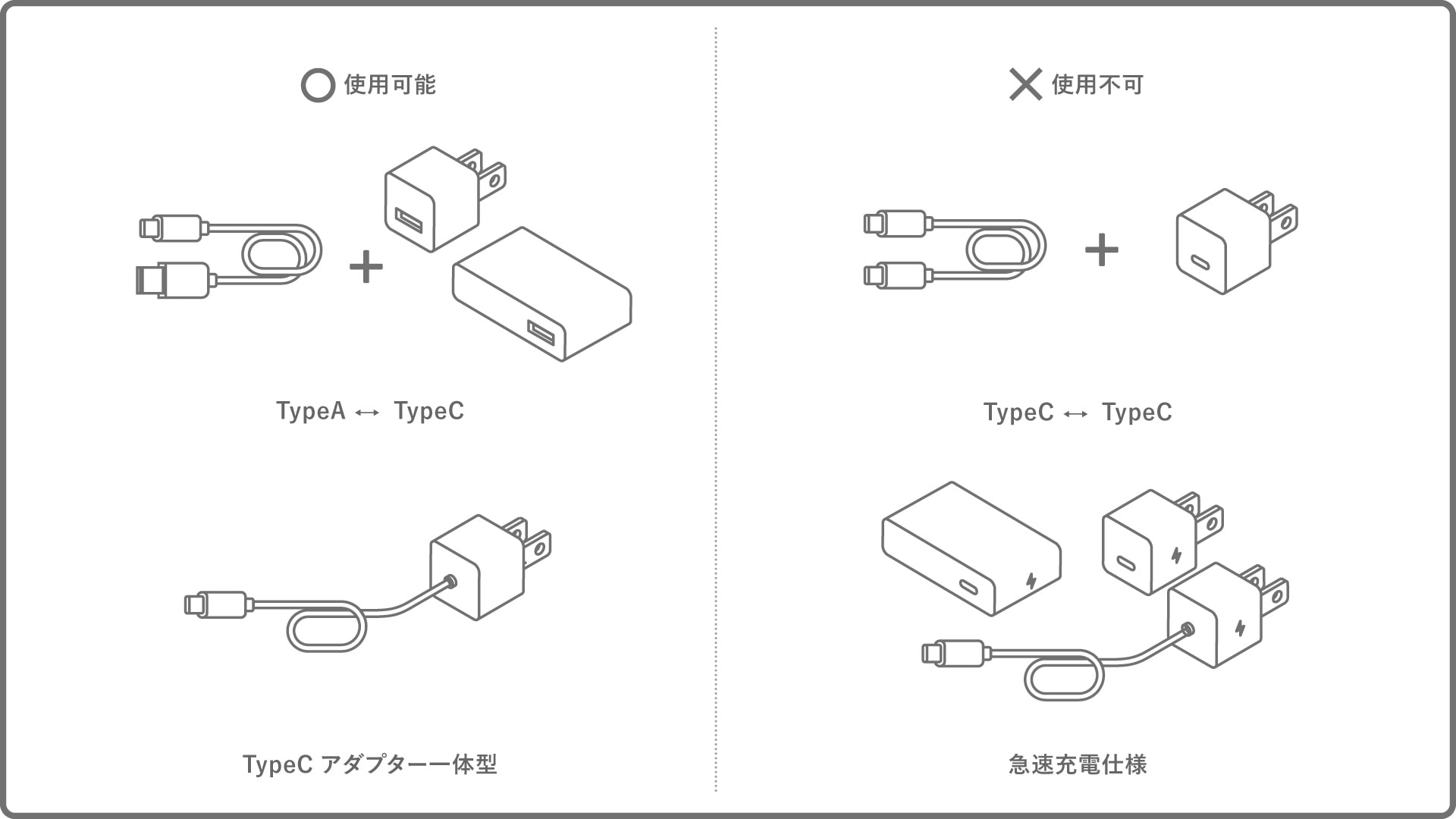 USB typec typecのケーブルおよび急速充電(PD,OC)には対応しておりません。 機器の破損や、発火の恐れがありますので、ご注意ください。