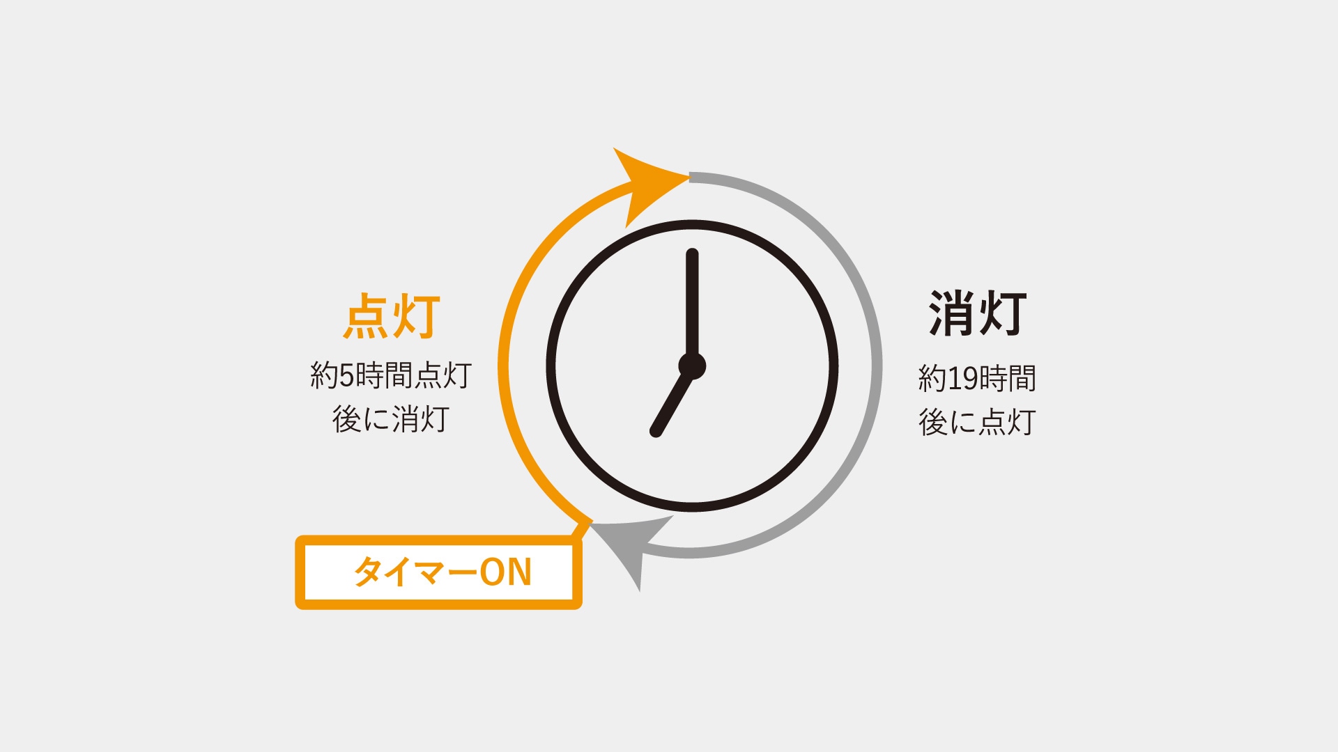 ONにしてから約5時間点灯。翌日およそ同じ時間に点灯、消灯を自動的にループします。暗くなったときに付けて、タイマーに設定しておくと自動で明日も点灯してくれます。※タイマーの時間には誤差がございます。